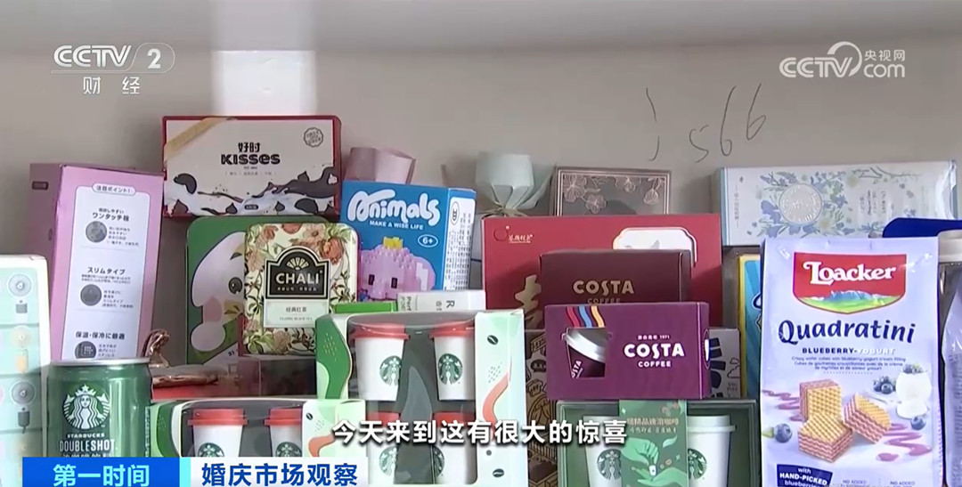 走进江苏常州钟楼区的一家喜糖批发店,不少新人正正在挑选喜糖。货架上摆满了各式新鲜的喜糖组合,除了保守的巧克力奶糖,商家还推出了“零食大礼包”式喜糖,将网红小饼干、果脯、冻干生果等年轻人喜爱的零食搭配。